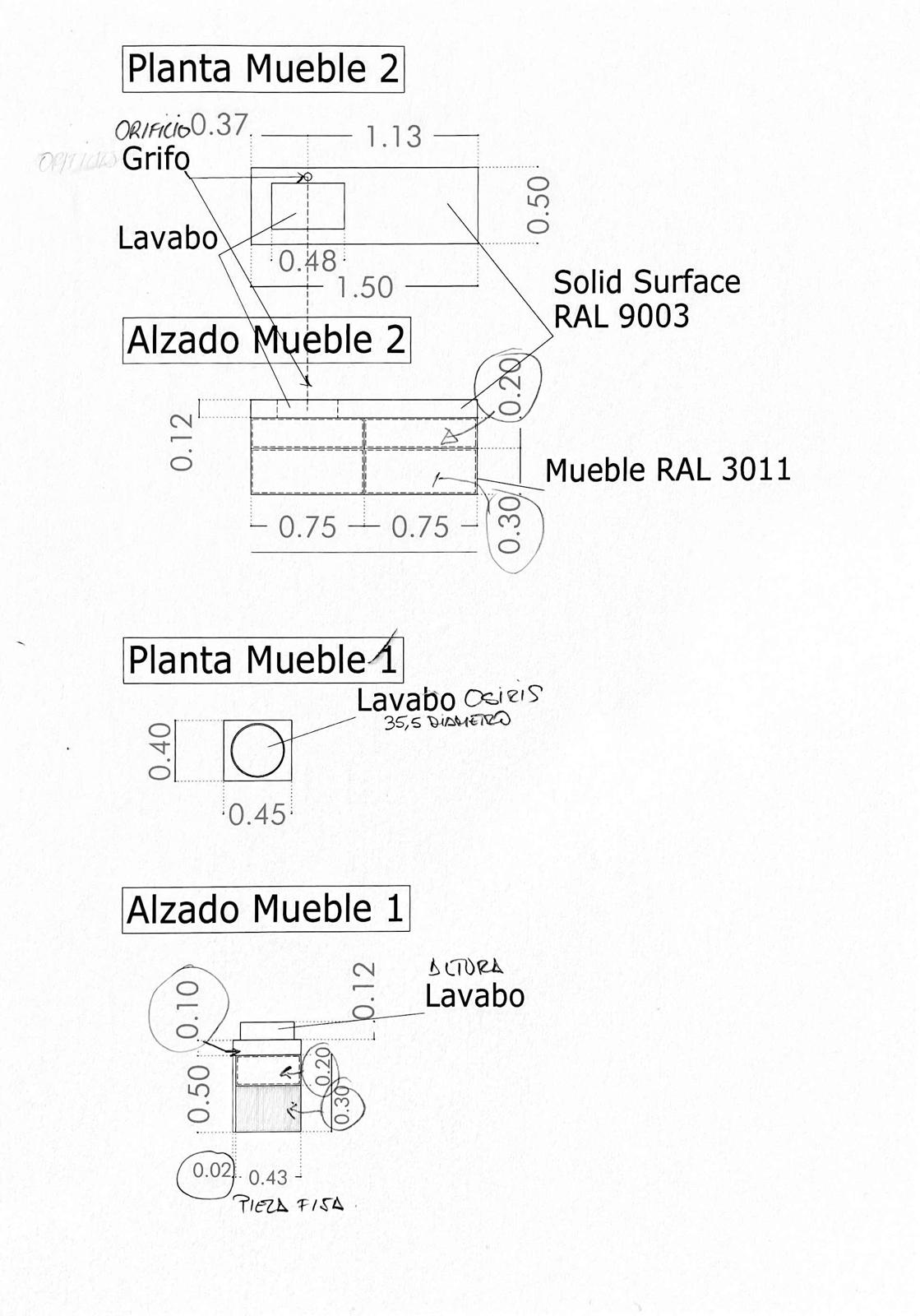 Mueble de baño DUNE 2 cajones roble claro 50 cm x 40 cm ( arriba liso – abajo palilleria ) – tapa con lavabo OSIRIS sin agujero griferia 3011 ( ver tema tapeta puerta ) – Mueble de baño DUNE 150cm 4 cajones ( 20 cm superior – 30 cm inferior ) ral 3011 – Encimera SOLID SURFACE con faldón 12 cm blanco lavabo desplazado izda.