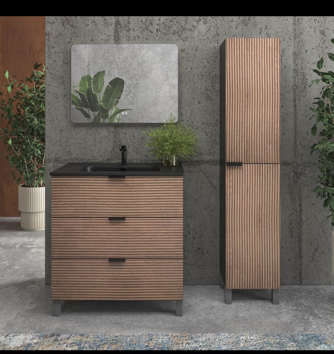 / Mueble de baño LUXOR 3 cajones BASTILLA / NEGRO 60 cm – Lavabo porcelana NEGRO 60 cm – Columna con patas 185x35x25 BASTILLA/NEGRO
